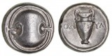 BOEOTIA, Thebes, (363-338 B.C.), silver stater (12.17 g), Olym., magistrate, obv. Boiotian shield, rev. amphora in concave field, spearhead to right above [off flan], across ...