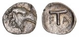 PELOPONNESOS, Elis, Olympia, 95th Olympiad, (400 B.C.), silver tetartemorion, (7mm, 0.18 g), obv. head of eagle right, rev. large T (mark of value), F A ...