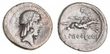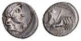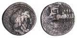 L. RUBRIUS DOSSENUS (87 BC), silver denarius (3.98 g), obv. laureate head of Jupiter right, sceptre over shoulder, rev. empty triumphal quadriga right, thunderbolt on ...
