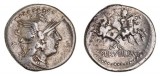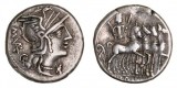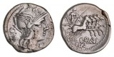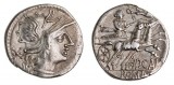 M. ABURIUS M.F. Geminus, (132 BC), silver denarius (3.91g), Rome mint, obv. helmeted head of Roma facing right, mark of value (XVI monogram) to below ...