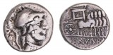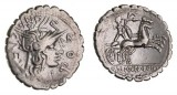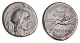 L. RUBRIUS DOSSENUS, (87 BC), silver denarius (3.70g), obv. Minerva facing right, wearing Corinthian helmet and aegis, DOS behind, rev. empty triumphal quadriga right, thunderbolt ...