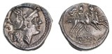 M. ATILIUS SARANUS, (148 BC), silver denarius (3.28g), obv. helmeted head of Roma, SARAN behind, X below chin, rev. the Dioscuri galloping right, M ATIL ...