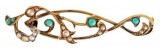 BROOCH, in gold (tested as 15ct; 3.47g; 44x11mm), no maker mark, features an elongated floral display decorated with turquoises and seed pearls, pin-back. Very fine.