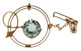 BROOCH, in gold (15ct; 3.42g; 24x27mm), by Wendt, features a double circular band with a claw set circular aquamarine in the centre with a stem ...