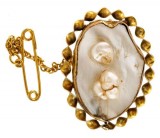 BROOCH, in gold (9ct; tot wt 5.45g; 22.5x29.5mm), maker unknown, features mother-of-pearl shell and blister pearls in a fitted frame and this inside a coiled ...