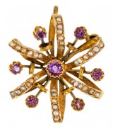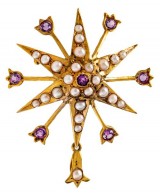 BROOCH/PENDANT, in gold (9ct; 5.40g; 38x36.5mm), attributed to Aronson & Co, features a star decorated with natural seed pearls with an amethyst in the centre, ...