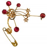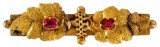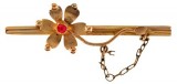 BROOCH, in gold (tested as 15ct; 2.80g; 39x10mm), by (A.A.) Castley, features a single bar heavily decorated and with two claw held red gemstones, pin-back, ...