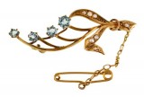 BROOCH, in gold (9ct; 3.88g; 43x29mm), attributed to Willis & Sons, features a thin bar with three prongs and at the ends of the bar ...