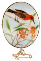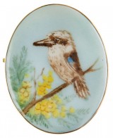 BROOCH, in hand painted porcelain in a gold frame (9ct; tot wt 15.26g; 39x50mm), attributed to Joseph Lawrence Pty Ltd, features a kookaburra facing left ...