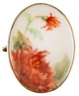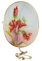 BROOCH, in hand painted porcelain in a gold frame (9ct; tot wt 10.29g; 34x44mm), attributed to Joseph Lawrence Pty Ltd, features a floral display, pin-back ...