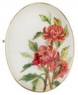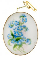 BROOCH, in hand painted porcelain in a gold frame (9ct; tot wt 23.46g; 43x54mm), attributed to Joseph Lawrence Pty Ltd, features a floral display, pin-back ...