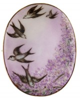 BROOCH, in hand painted porcelain in a gold frame (9ct; tot wt 22.50g; 43x54mm), by W.T.M&Co (details unknown), features a flock of birds and a ...