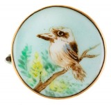 BROOCH, in hand painted porcelain in a gold frame (9ct; tot wt 4.74g; 24.5mm), attributed to Willis & Sons, features a kookaburra facing left and ...