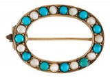 BROOCH, in gold (tested as 15ct; 1.84g; 22x17mm), attributed to Duggin, Shappere & Co, features a voided oval lined with seed pearls and turquoises with ...