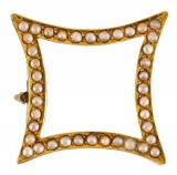 BROOCH, in voided gold (15ct; 2.90g; 22x22mm), attributed to Willis & Sons, features a square with open centre and curved inward arms decorated with seed ...