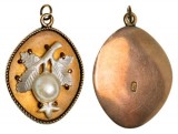 DIAMOND AND CORAL PENDANT, c1870, in gold (18ct; 24.09g; 35x42mm), attributed to Kilpatrick & Co, features a gold locket with a centre strip of three ...