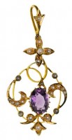 AMETHYST AND PEARL PENDANT, in gold (15ct; 4.23g; 22x44mm), attributed to maker, Duggin, Shappere & Co, features a voided floral display decorated with natural pearls ...