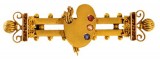 ARTIST BROOCH, in gold (15ct; 5.50g; 51x17mm), attributed to maker, Duggin, Shappere & Co, features a highly decorated double bar with an artist's paint tin ...