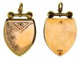 SHIELD PENDANT, in gold (9ct; 3.72g; 23x33mm), attributed to maker, Willis & Sons, features a decorated shield below a dumbbell shaped suspender, the shield with ...
