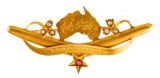 AUSTRALIA WISHBONE BROOCH, in gold (9ct; 1.44g; 32x17mm), attributed to maker, Webster & Cohen, features a wishbone with the coat-of-arms of Australia on the outside, ...