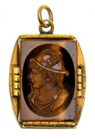 PENDANT, a glass cameo in gold (9ct; tot wt 4.91g; 18x22mm), by Perryman (& Co), features a glass cameo of a lady wearing a hat ...