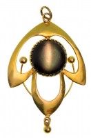 STONE PENDANT, c1915, in voided gold (15ct; 3.55g; 28x38mm), by Perryman (& Co), features a circular polished natural stone claw set in a decorative pendant ...