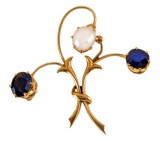 ART NOUVEAU BROOCH, c1905, in gold (15ct; 2.88g; 29x26.5mm), by J.M.W. (J.M.Wendt), features an artistic display featuring two claw set sapphires and a claw set ...