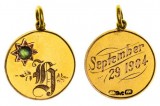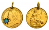 PENDANT, gold plated Great Britain 1897 farthing, attributed to S.Schlank, features a small opal claw set into a star carved on the obverse of a ...