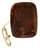 JASPER BROOCH, in gold frame (9ct; tot wt 13.25g; 41x31mm), by (A.B.) Budgen, features a rectangular piece of jasper fitted in a gold frame, pin-back ...