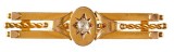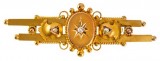 DIAMOND BROOCH, c1900, in gold (15ct; 4.75g; 52x18mm), by Perryman (& Co), features a decorative double bar with an oval centerpiece engraved with a star ...