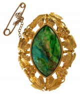 GREEN STONE BROOCH, c1930, in gold (9ct; 7.95; 61x37mm), by Wendts, features a thin bar and in the centre is a claw set oval Burra ...