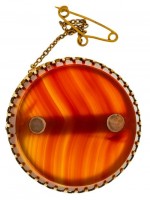 GERMAN AGATE BROOCH, c1900, in gold frame (9ct; tot wt 13.34g; 33mm), by A.O.Kopp, features a circular German agate claw set with two securing lugs ...