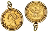 COIN JEWELLERY, each in clip surround mount with link suspensions, Belgium, twenty francs, 1867; France, twenty francs, 1905; Germany, Prussia, twenty mark, 1912A; Great Britain, ...