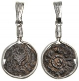 ANCIENT COIN PENDANT, copper prutah set in a silver suspension frame (3.14 g total weight). Very fine.