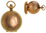 SOVEREIGN CASE, in 9 carat gold, floral hand engravings on front and back and shield area with "E S" initials, inside engraved "From A.E Wigney ...