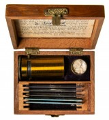 GERMAN VINTAGE POCKET MICROSCOPE, in brass and in small timber case (84x65x37mm) of issue with five internal slides (appears to be one missing), with printed ...