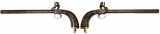 ANTIQUE FLINTLOCK PISTOL ACCESSORIES, includes small brass trigger action powder dispenser with suspension ring at base; small brass pistol ball holder; small engraved metal pistol ...