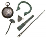 WRECK ARTEFACTS, brass slave manilla from the 1843 wreck of the Duoro; copper alloy bell, chisel, needle, and nail from the 1622 wreck of Nuestra ...