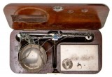 TWO PAN BALANCE SET, with brass weights and original wooden box, c. 1900. Very fine.