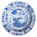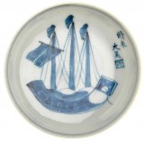 CHINA, late Qing Dynasty, (19th century), blue and white export ware porcelain dish, ship motif in bowl, two lines around rim, simple alternating geometric pattern ...