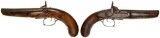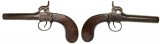 PERCUSSION PISTOL, smooth .45 calibre bore, mid-late 19th century, curved plain timber grip, some inscribed decorations on side plates, trigger guard, and top plate, plain ...