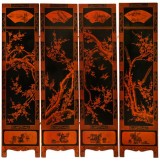 CHINA, early twentieth century, four panel screen, black lacquered timber, depicting birds in nature in red paint on one side, and bamboo in yellow paint ...