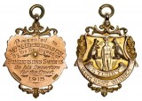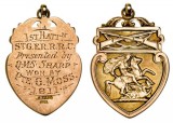 ST GEORGES ENGLISH RIFLE REGIMENT RIFLE CLUB, prize fob in gold (9ct; 8.35g; 27x35mm), by W.Kerr, scroll and ring top suspension, reverse inscribed, '1st Battn/St ...