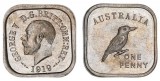 GEORGE V, Melbourne Mint pattern square, cupro-nickel kookaburra penny 1919, by Stokes & Son (R. type 3) (4.02g). Choice uncirculated and rare, especially in this ...