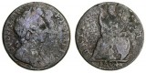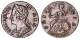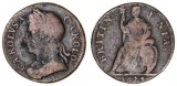 GEORGE I, halfpenny, 1717, "dump" first issue, struck on a broad flan of the second issue (S.3659). Pitted surface, dark brown patina, possibly unique.