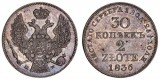 POLAND, Congress Kingdom, Nicholas I, 30 kopeks or 2 zloty, 1836 (KM.C.132, Kop 9417). Good extremely fine.