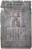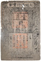 CHINA, Ming Dynasty, Da Ming Baochao, 1 kuan, issued banknote (P.AA10), printed on dark grey mullberry paper, two large red seals of face. Edge losses, ...