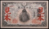 JAPAN, Bank of Japan, specimen one yen (1944-45) red 'Mi-hon' overprint and perforated, serial block 56 (P.54s1). Nearly uncirculated.