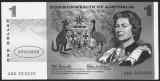 DECIMAL SPECIMEN BANKNOTES, one each of the one dollar, Coombs/Wilson AAA000000; two dollars, Coombs/Wilson FAA000000; ten dollars, Coombs/Wilson SAA000000; twenty dollars, Coombs/Wilson XAA000000, with small ...