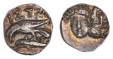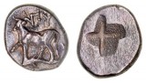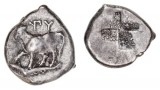 THRACE, Byzantion, (357-340 B.C.), silver tetrobol, (2.55 g), obv. cow standing to left, on dolphin to left, foreleg raised, above V**PU*, rev. quadripartite incuse square ...